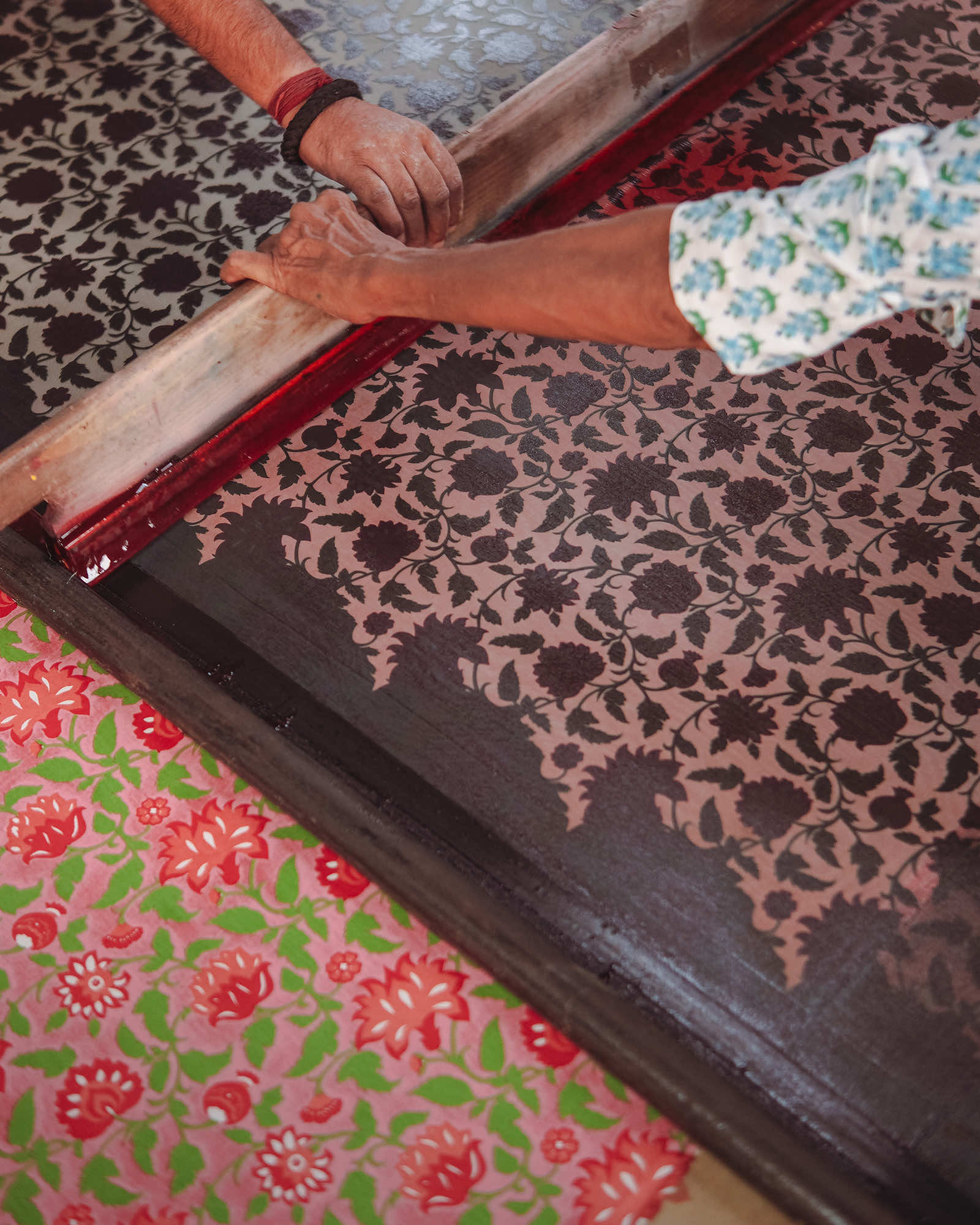 Screen-printing is a meticulous, hands-on process that brings bold, vibrant patterns to life with incredible depth and softness. Hand-drawn and carefully cut stencils are layered onto a silk or mesh screen, and ink is expertly pushed through by two artisans working in perfect rhythm. Moving methodically across the fabric, they ensure every inch is evenly saturated with rich, luminous colour.