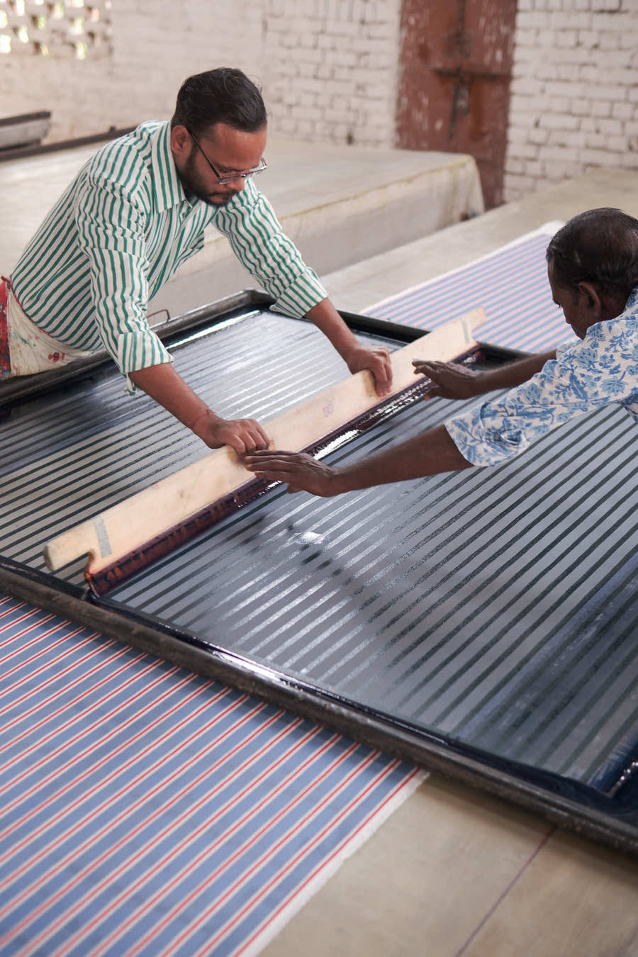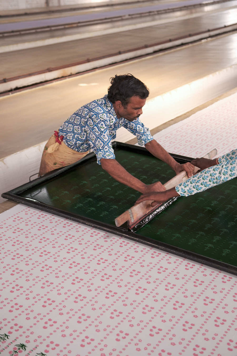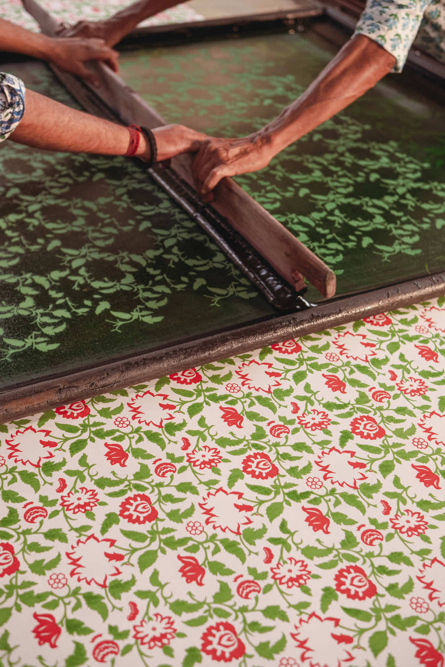 Screen-printing is a meticulous, hands-on process that brings bold, vibrant patterns to life with incredible depth and softness. Hand-drawn and carefully cut stencils are layered onto a silk or mesh screen, and ink is expertly pushed through by two artisans working in perfect rhythm. Moving methodically across the fabric, they ensure every inch is evenly saturated with rich, luminous colour.